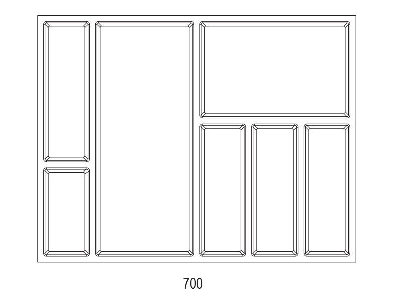 Příborníky jsou rozměrem připraveny pro zásuvky s tenkými bočnicemi (StrongMax, Blum Legrabox). V rozměrech od 40 do 1200 mm šířy skříňky. Lze je vzájemně kombinovat. Je tu i možnost doplnit o držák nožů, řezačku folii a také o další posuvná dělítka pro personalizaci podle přání zákazníka.