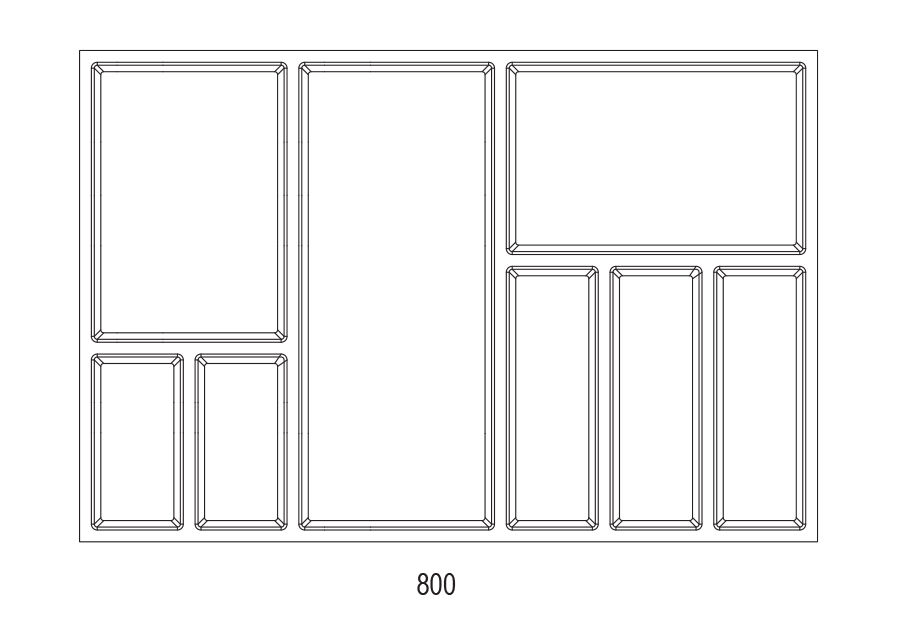 Příborníky jsou rozměrem připraveny pro zásuvky s tenkými bočnicemi (StrongMax, Blum Legrabox). V rozměrech od 40 do 1200 mm šířy skříňky. Lze je vzájemně kombinovat. Je tu i možnost doplnit o držák nožů, řezačku folii a také o další posuvná dělítka pro personalizaci podle přání zákazníka.