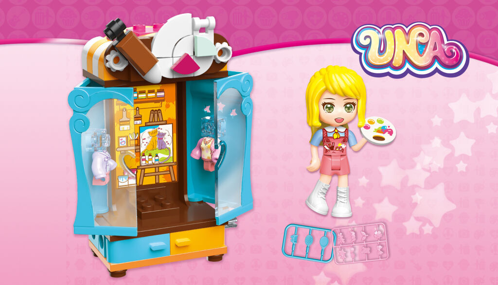 Osm variant stavebnic skříní s tématicky příslušícím vybavením a motivy, každá je vybavena jednou dívčí figurkou. Ve své přepychové šatní skříni vždy najdete, co hledáte, ať už chcete být stewardkou, doktorkou, nebo malířkou. Vyberte si a postupně sbírejte: