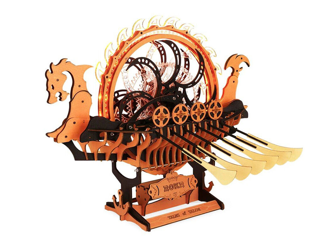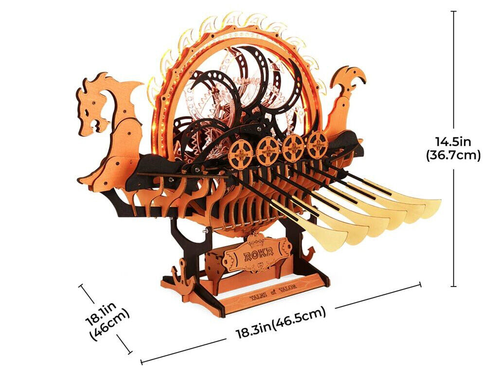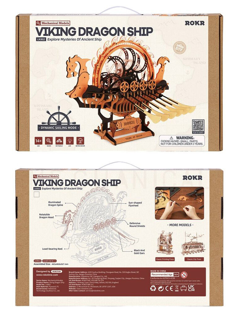 Skládačka je vybavena mechanismem, který zajišťuje synchronizovaný rotační pohyb všech vesel. Nad celou lodí prochází prosvětlená plastová dračí páteř, která je výraznější díky třpytivému efektu a syté barvě. Skládačka umožňuje užít si kreativní a edukativní hraní a zároveň vytvořit nádherný model s LED osvětlením, který se může stát netradičním dárkem či ozdobou interiéru. Skládání 3D skládačky podporuje rozvoj jemné motoriky, prostorového myšlení a trpělivosti. Pozvěte svou rodinu nebo přátele a užijte si zábavné tvoření bez nutnosti použití lepidla nebo nástrojů. Všechny díly skládačky jsou přesně vyřezané a očíslované a lehce do sebe zapadnou, aby výsledek byl stabilní a odolný.