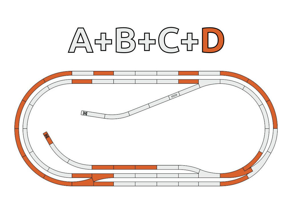 Rozšiřující sada kolejí s detailní reprodukcí dřevěných pražců na štěrkovém podloží, ve věrných barvách. Zahrnuje součásti ke stavbě paralelní trati připojené prostřednictvím dvojice jednoduchých a jedné obloukové výhybky. Ke kompletaci tratě z ilustračního obrázku je nutno prve vlastnit, či zakoupit základní ovál s podložím (A) a rozšiřující sady kolejí B a C (č. 61101 a 61102). Základní ovál se skládá z 12 ks obloukových kolejí R3 (č. 61123) a 8 ks přímé koleje G200 (č. 61110).