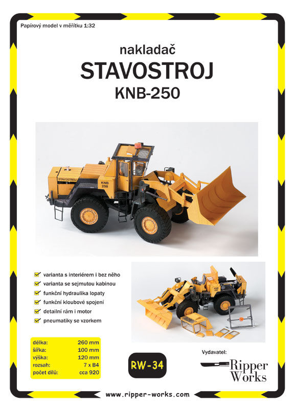 Model můžete vytvořit s interiérem kabiny či bez něj, případně můžete celou horní polovinu kabiny ponechat sundanou (pro transport), rovněž nemusíte osazovat ochrannou hrazdu (ze stejného důvodu). Kryty motoru jsou snímací, některé kryty můžete ponechat v celku (snáze tak zachováte geometrii. Model má funkční kloubové spojení, stejně tak jako všechny části pracovní lopaty.