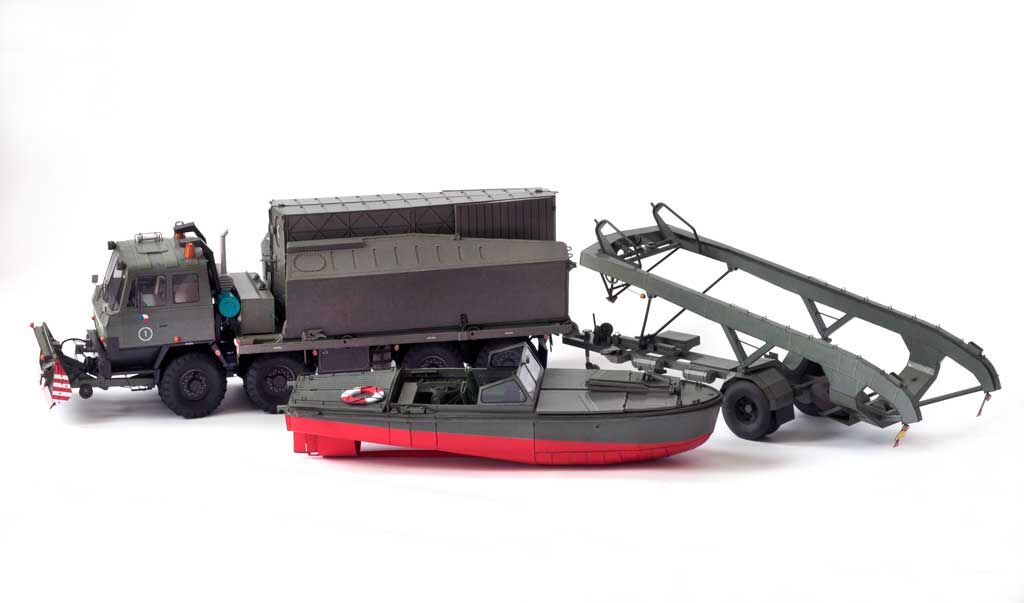 Člun obsahuje motor i interiér nástavby. Tlačná vidlice na přídi je pohyblivá, stejně jako kryty nad motorem. Při naložení na SP-5 je třeba „sklopit“ stožárek a přední sklo, případně celý interiér překrýt plachtou. Člun na podvozku zapojte buď za přepravník břehového dílu PMS (vydává RipperWorks jako RW-48, celek si můžete doplnit ještě přepravníkem s říčním dílem RW-49), případně za jiné vhodné vojenské vozidlo od RipperWorks (například Tatra 815 VT či VVN nebo Tatra 148 VNM).