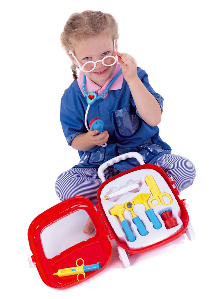 Sada obsahuje vše, co malý lékař potřebuje k ošetření pacientů. Všechny potřebné nástroje jsou uloženy v elegantním kufříku na kolečkách.