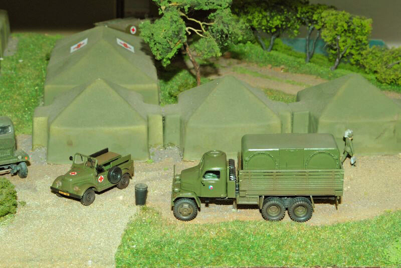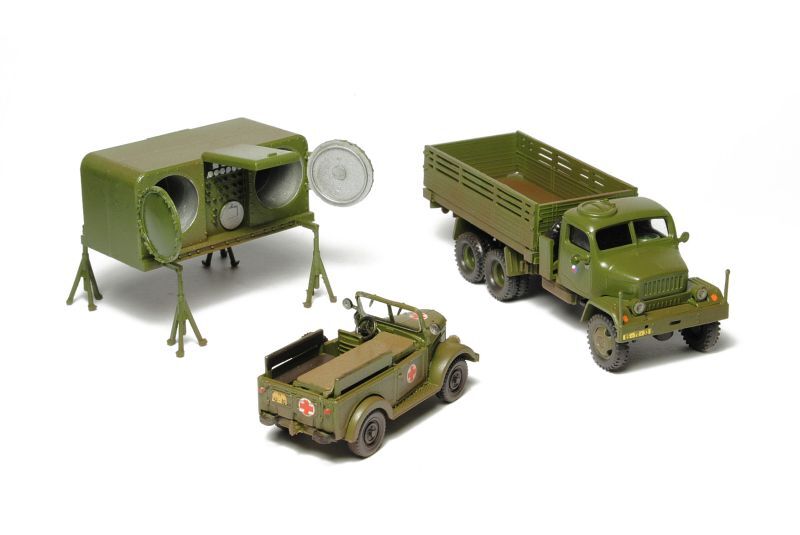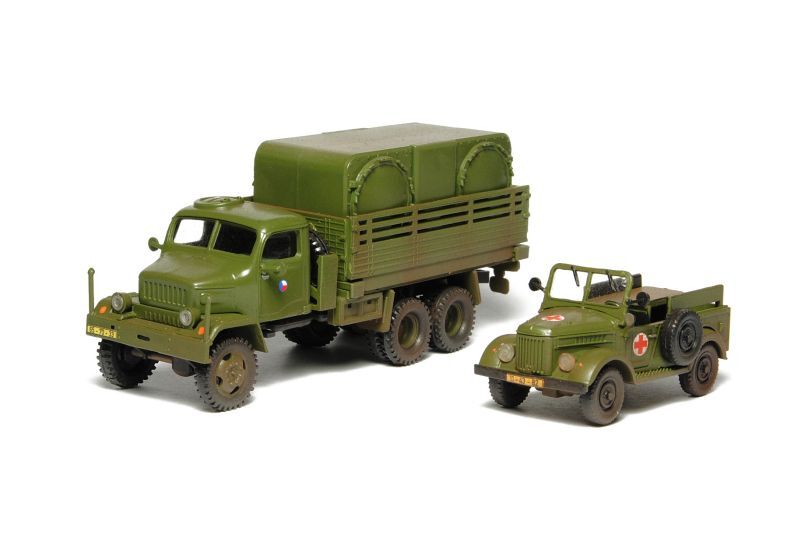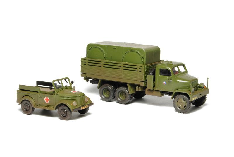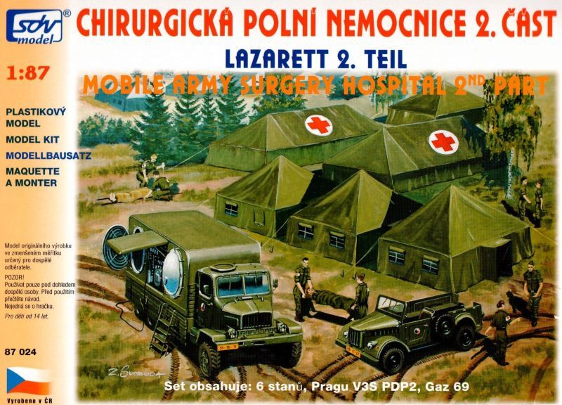 Kompletní plastiková stavebnice. Obsahuje nákladní vozidlo Pragu V3S s novou nástavbou pro desinfekci výstroje, Gaz 69 v úpravě pro převoz raněných a sadu stanů, dále kovové osičky pro obě vozidla a sadu obtisků.