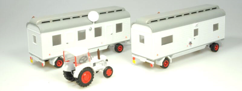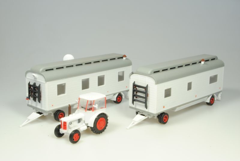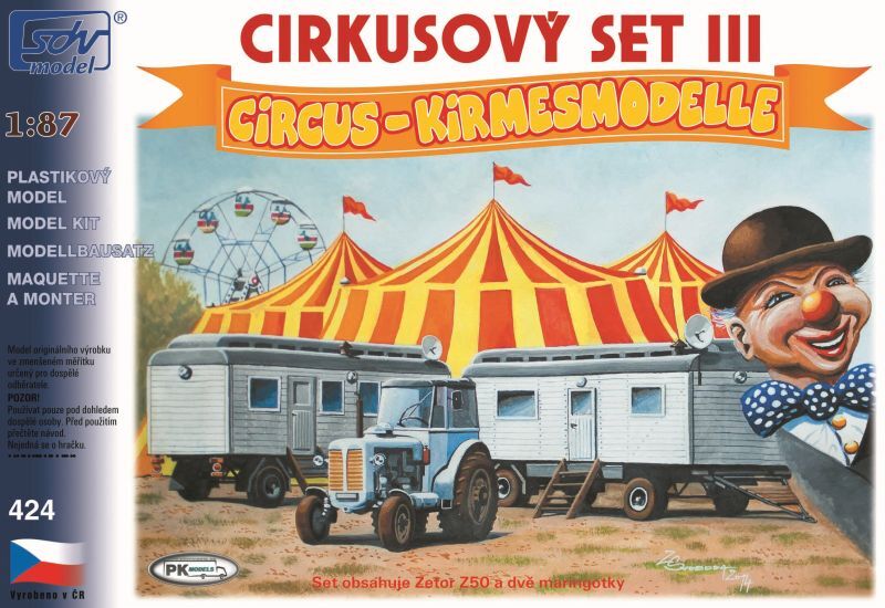 Kompletní plastiková stavebnice Zetoru 50 a dvou kusů cirkusových přívěsů. Obsahuje probarvené plastikové výlisky na sestavení modelů, kovové osičky pro přívěsy a sadu obtisků pro traktor.