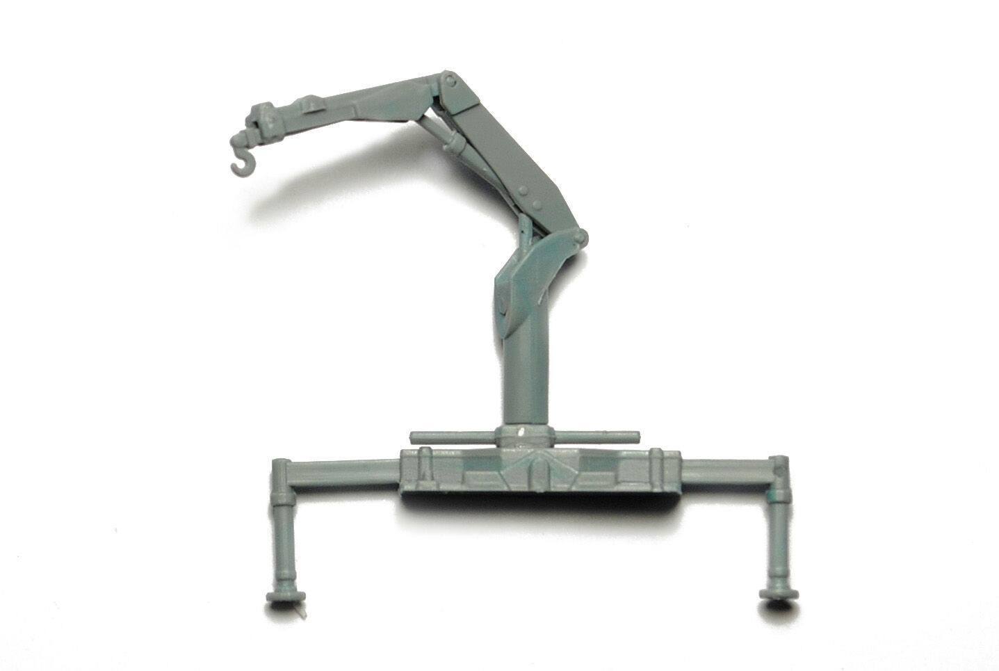 Stavebnice hydraulické ruky HR 3001. Obsahuje opěrné nohy, rameno a výložníky s hákem a drapákem. Ruku je možné sestavit pohyblivou. Stavebnice obsahuje obtisky.