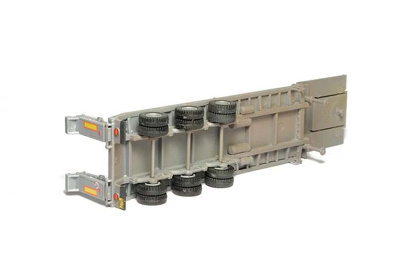 Kompletní plastiková stavebnice návěsového podvalníku. Obsahuje probarvené plastikové výlisky na sestavení modelu, kovové osičky a sadu obtisků.