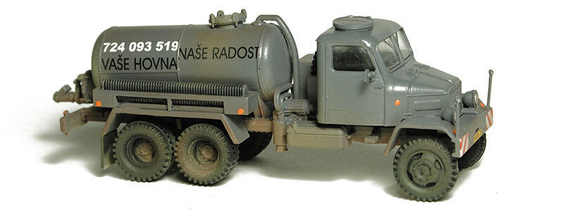Kompletní plastiková stavebnice fekálního automobilu. Obsahuje probarvené plastikové výlisky na sestavení modelu, kovové osičky a sadu obtisků.