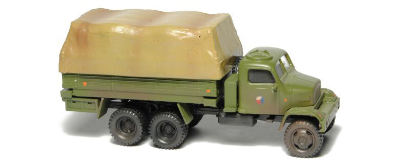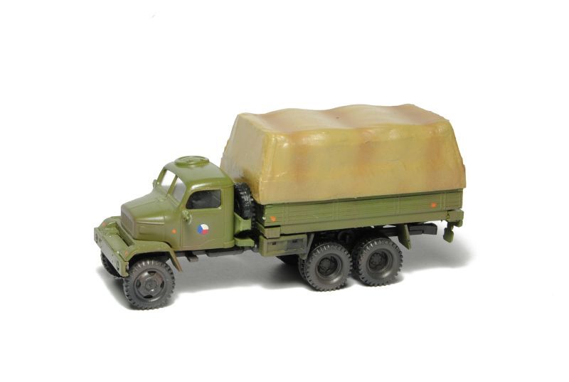 Kompletní plastiková stavebnice vojenského valníku. Obsahuje probarvené plastikové výlisky na sestavení modelu, kovové osičky a sadu obtisků ČSLA, AČR a ASR.