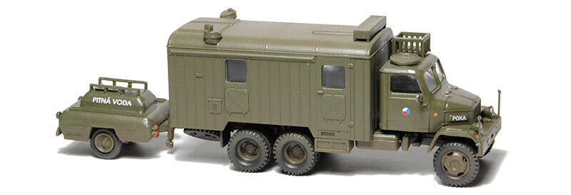 Kompletní plastiková stavebnice vojenské polní kuchyně. Obsahuje probarvené plastikové výlisky na sestavení modelů, kovové osičky a sadu obtisků ČSLA, AČR a ASR.