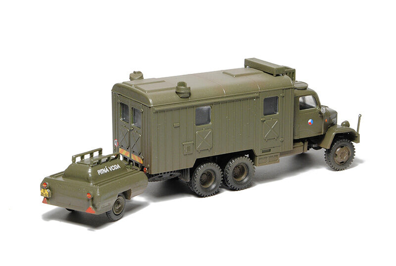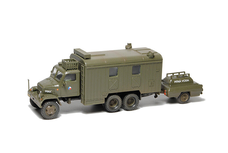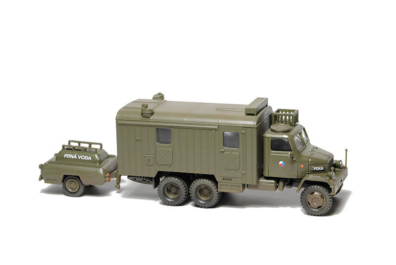 Kompletní plastiková stavebnice vojenské polní kuchyně. Obsahuje probarvené plastikové výlisky na sestavení modelů, kovové osičky a sadu obtisků ČSLA, AČR a ASR.