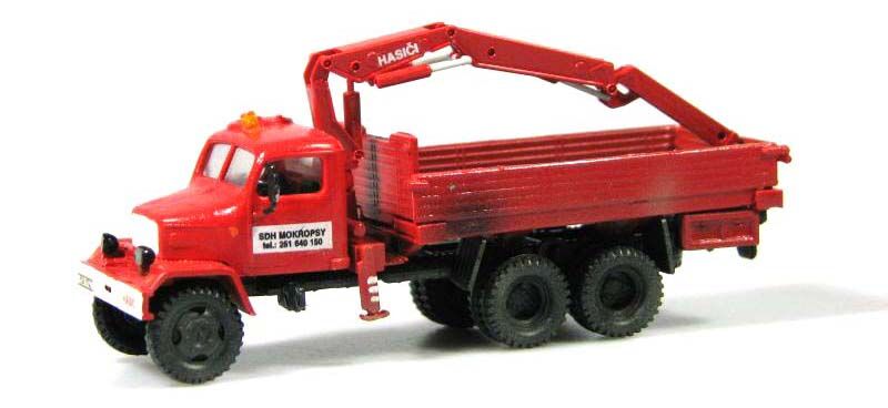 Kompletní plastiková stavebnice valníku s hydraulickou rukou SDH Mokropsy. Obsahuje probarvené plastikové výlisky na sestavení modelu, kovové osičky a sadu obtisků.