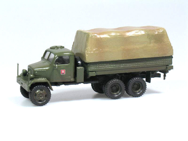 Kompletní plastiková stavebnice vojenského valníku. Obsahuje probarvené plastikové výlisky na sestavení modelu, kovové osičky a sadu obtisků ČSLA, AČR a ASR.