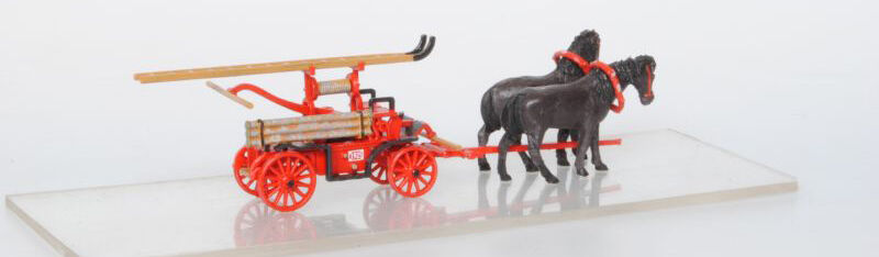 Kompletní plastiková stavebnice ruční čtyřkolové zápřahové stříkačky Smékal & spol. Obsahuje probarvené plastikové výlisky na sestavení modelu, 2 koně, kovové osičky a sadu obtisků.