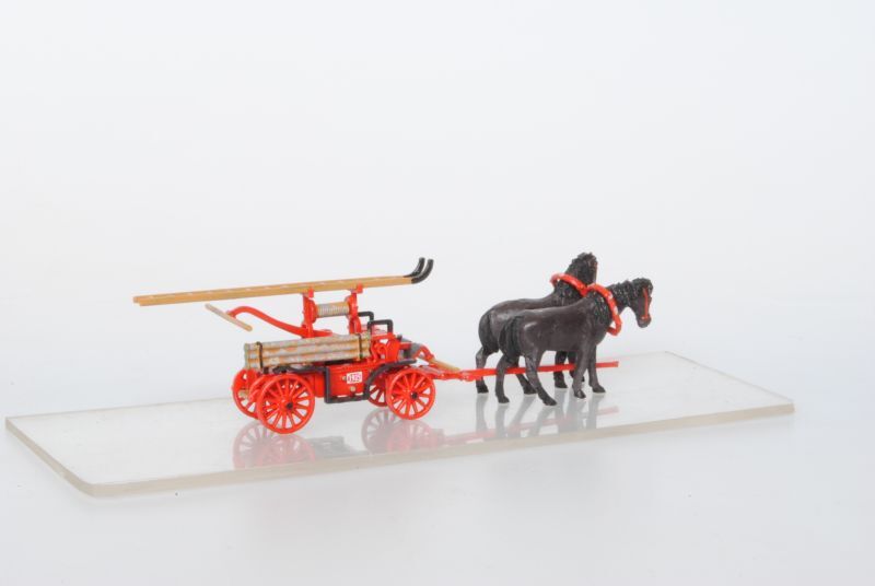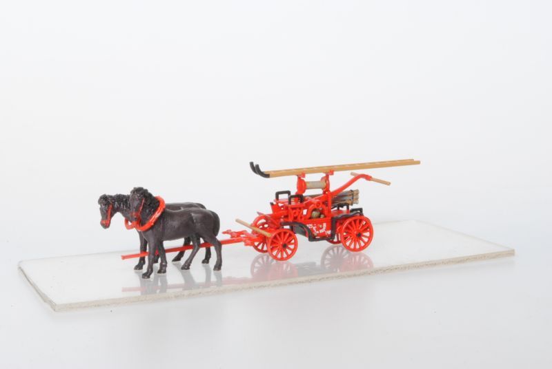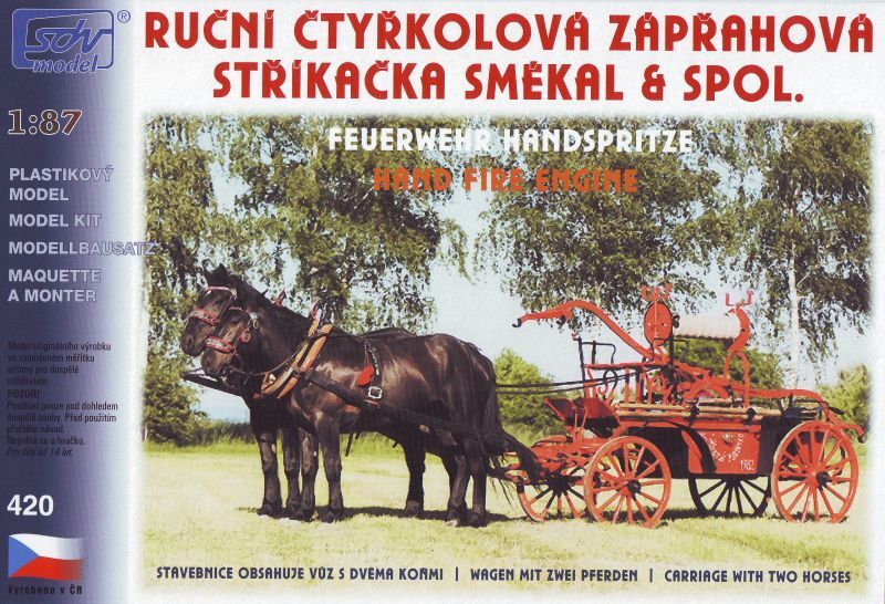 Kompletní plastiková stavebnice ruční čtyřkolové zápřahové stříkačky Smékal & spol. Obsahuje probarvené plastikové výlisky na sestavení modelu, 2 koně, kovové osičky a sadu obtisků.
