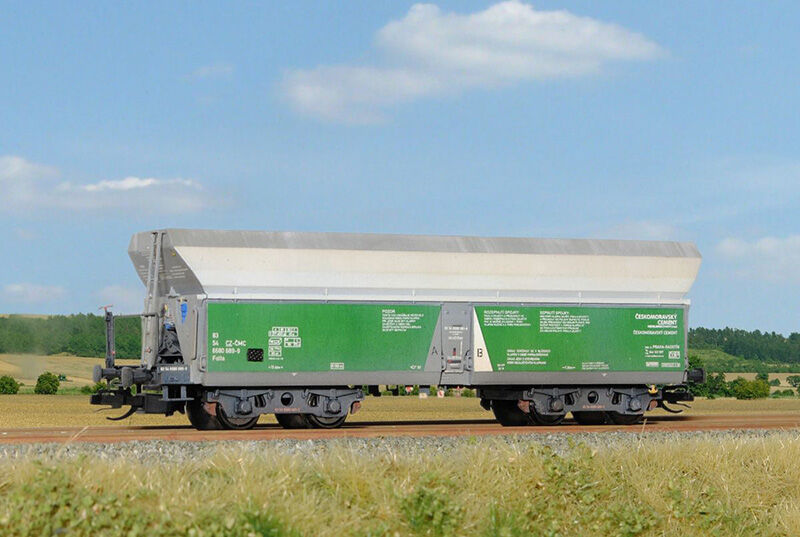 Kompletní stavebnice samovýsypného vozu. Obsahuje plastikové výlisky na sestavení modelu včetně kinematik, spřáhel a kvalitních soustružených kovových dvojkolí, kovové lepty, závaží a obtisky. Provozovatel Českomoravský cement, V.-VI. epocha.
