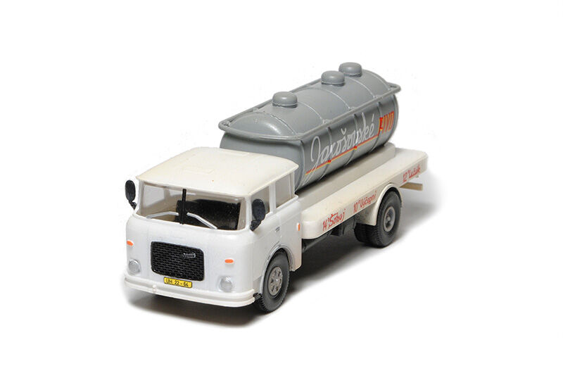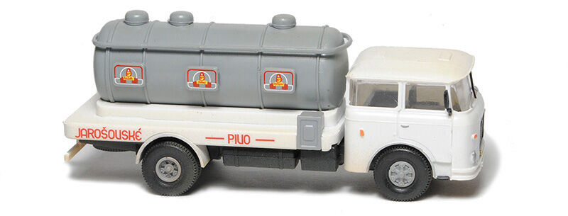 Kompletní plastiková stavebnice automobilu pro převoz piva. Obsahuje probarvené plastikové výlisky na sestavení modelu, kovové osičky a sadu obtisků.