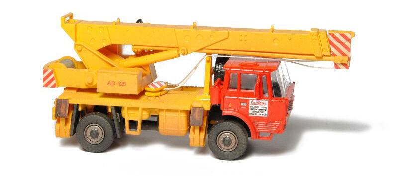 Kompletní plastiková stavebnice automobilového jeřábu. Obsahuje probarvené plastikové výlisky na sestavení modelu, kovové osičky a sadu obtisků.