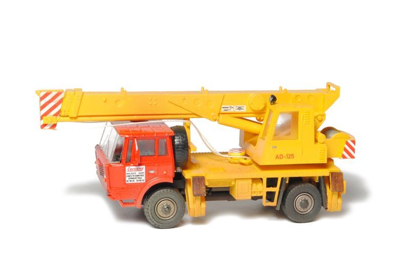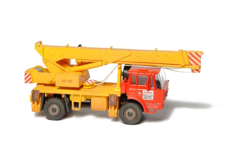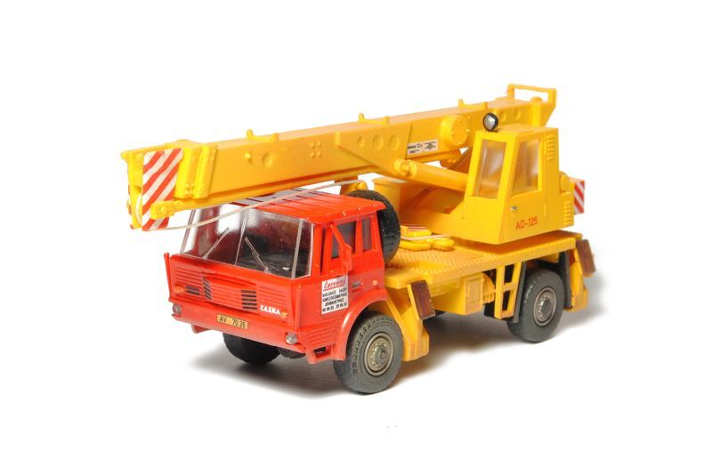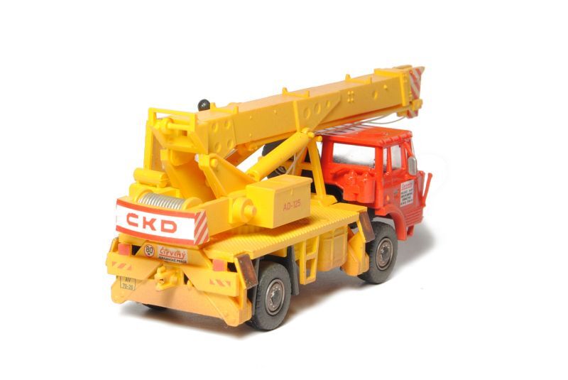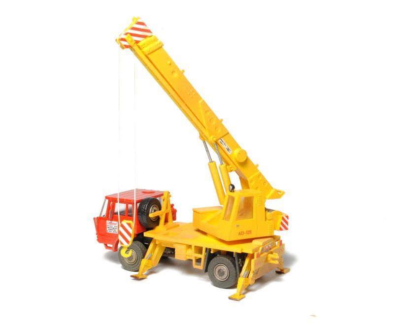 Kompletní plastiková stavebnice automobilového jeřábu. Obsahuje probarvené plastikové výlisky na sestavení modelu, kovové osičky a sadu obtisků.