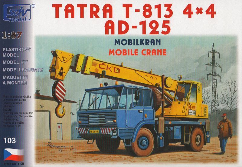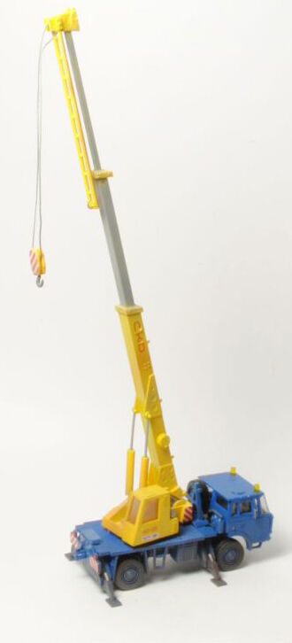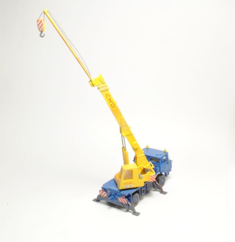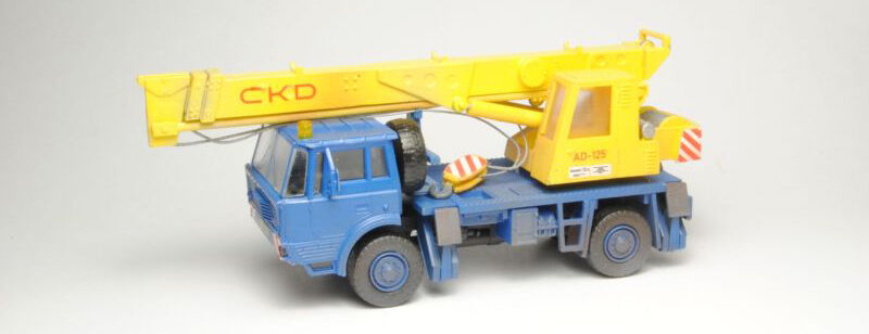 Kompletní plastiková stavebnice automobilového jeřábu. Obsahuje probarvené plastikové výlisky na sestavení modelu, kovové osičky a sadu obtisků.
