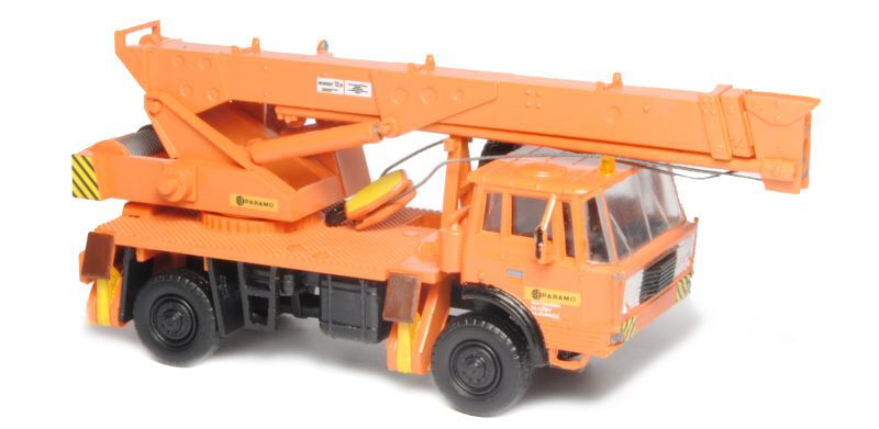 Kompletní plastiková stavebnice automobilového jeřábu. Obsahuje probarvené plastikové výlisky na sestavení modelu, kovové osičky a sadu obtisků.