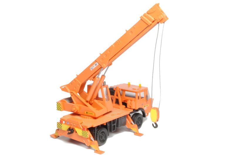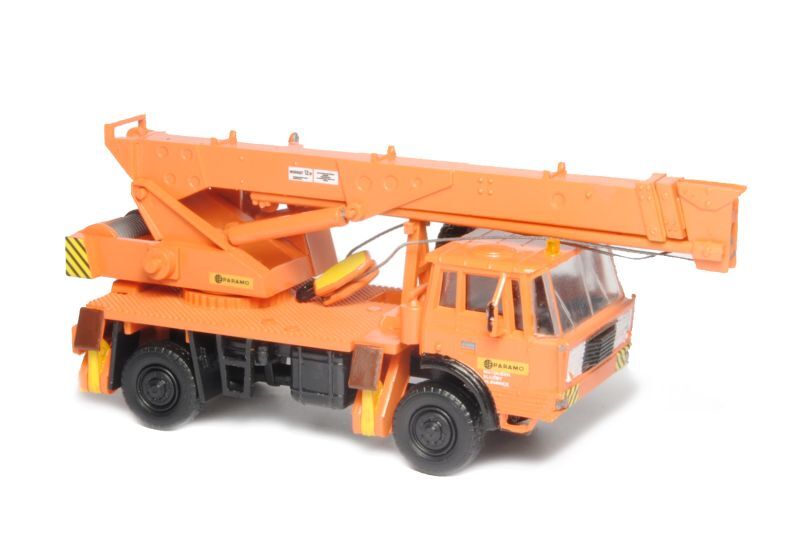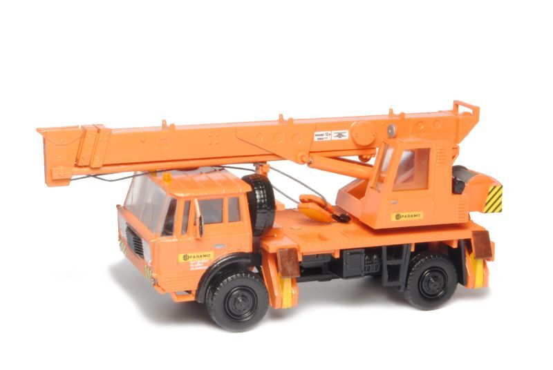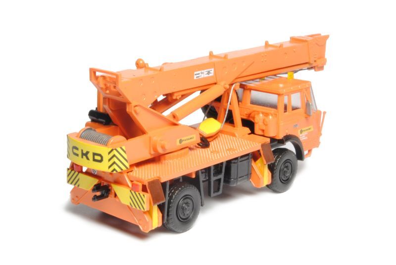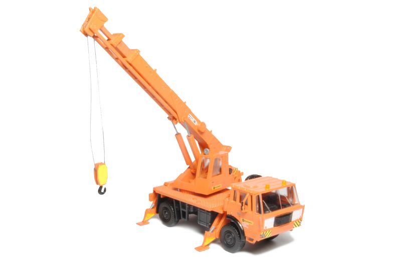Kompletní plastiková stavebnice automobilového jeřábu. Obsahuje probarvené plastikové výlisky na sestavení modelu, kovové osičky a sadu obtisků.