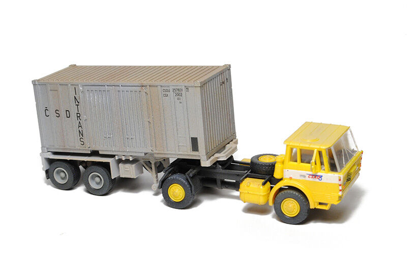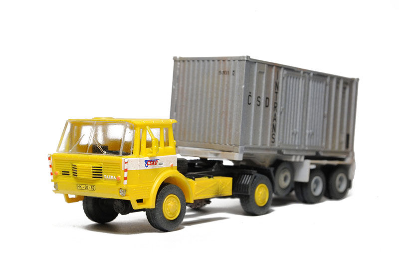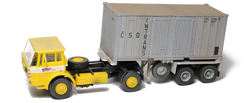 Kompletní plastiková stavebnice Tatry 813 4×4 NT a návěsu HLS 200.78/T s kontejnerem Gtt 3. Obsahuje probarvené plastikové výlisky na sestavení modelů, kovové osičky a sadu obtisků.