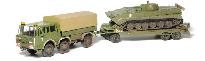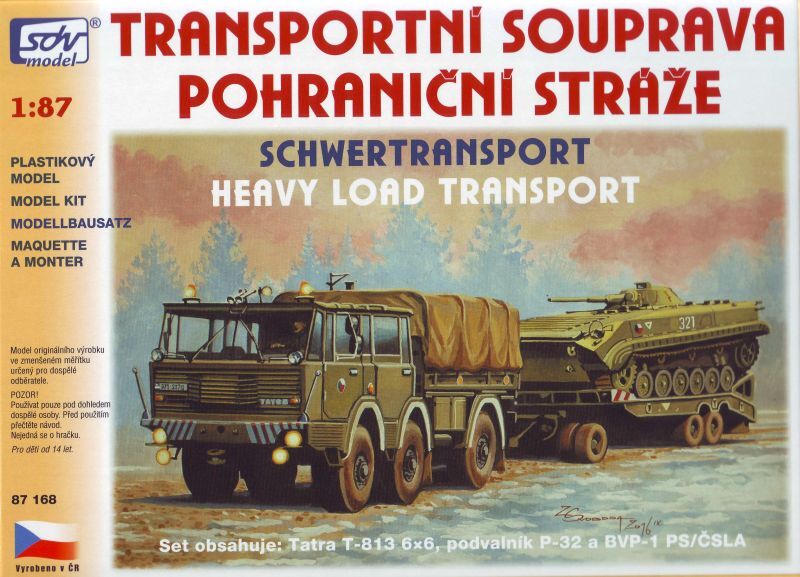 Kompletní plastiková stavebnice Tatry 813 6×6 TP, podvalníku P-32 a transportéru BVP-1. Obsahuje probarvené plastikové výlisky na sestavení modelů, kovové osičky a sadu obtisků.