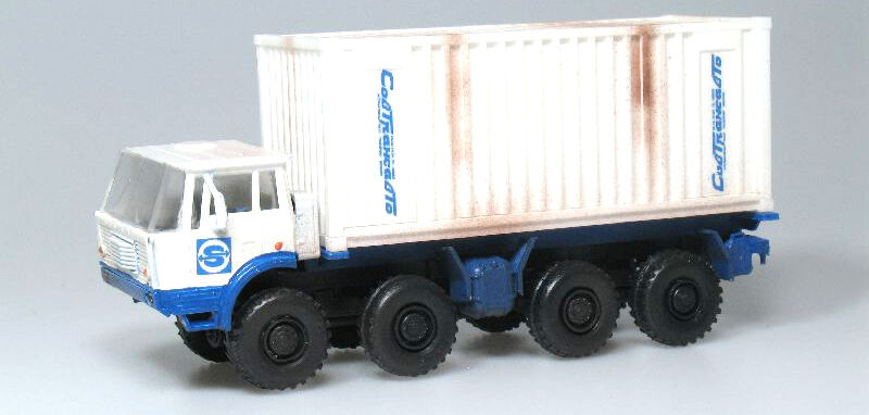 Kompletní plastiková stavebnice tahače přívěsů. Obsahuje probarvené plastikové výlisky na sestavení modelu, majáky, kovové osičky a sadu obtisků.
