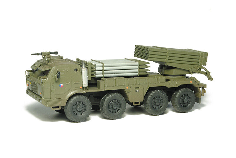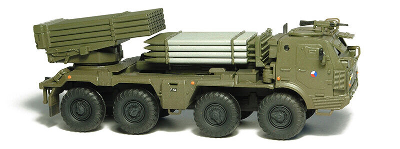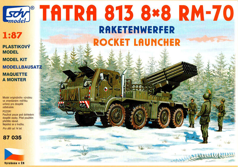 Kompletní plastiková stavebnice raketometu RM-70 Grad. Obsahuje probarvené plastikové výlisky, leptané doplňky, kovové osičky a sadu obtisků.