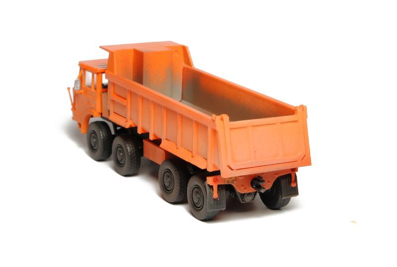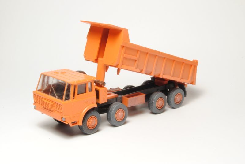 Kompletní plastiková stavebnice jednostranného sklápěče. Obsahuje probarvené plastikové výlisky na sestavení modelu, kovové osičky a sadu obtisků.