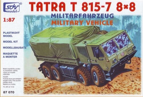 Kompletní plastiková stavebnice vojenského vozidla Tatra 815-7. Obsahuje probarvené plastikové výlisky na sestavení modelu, leptané doplňky a sadu obtisků.
