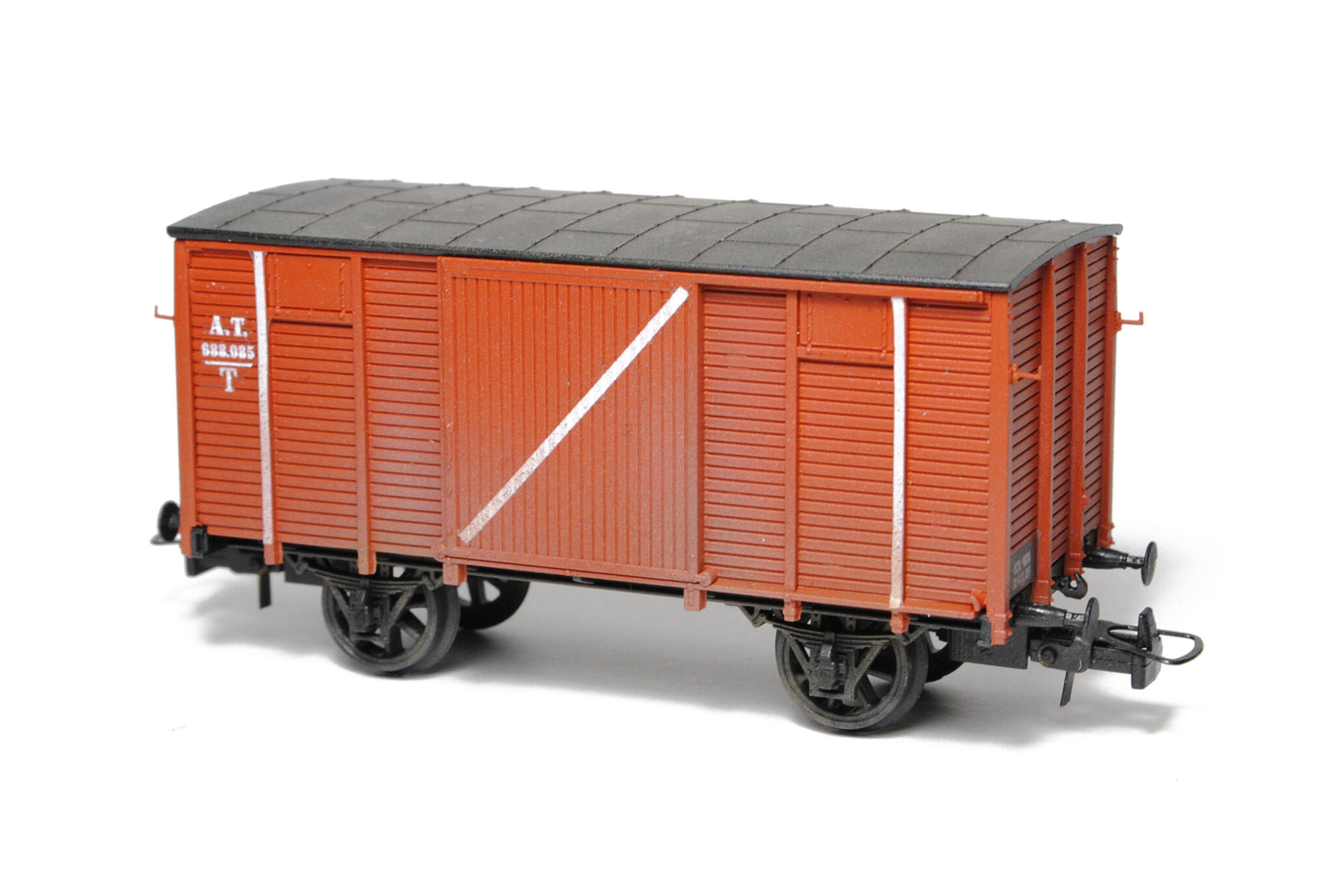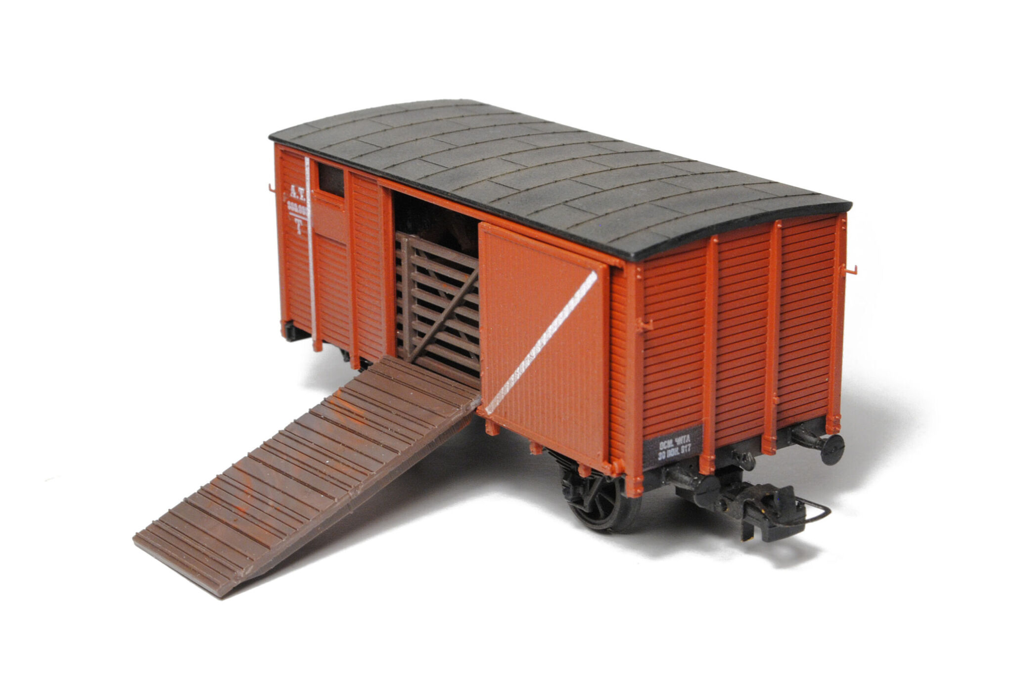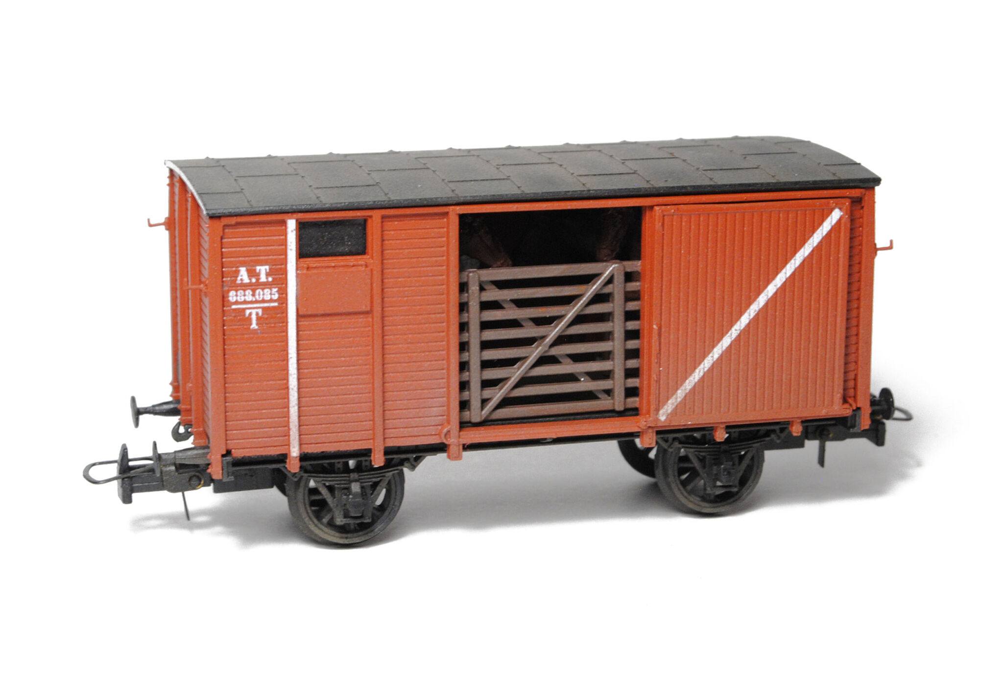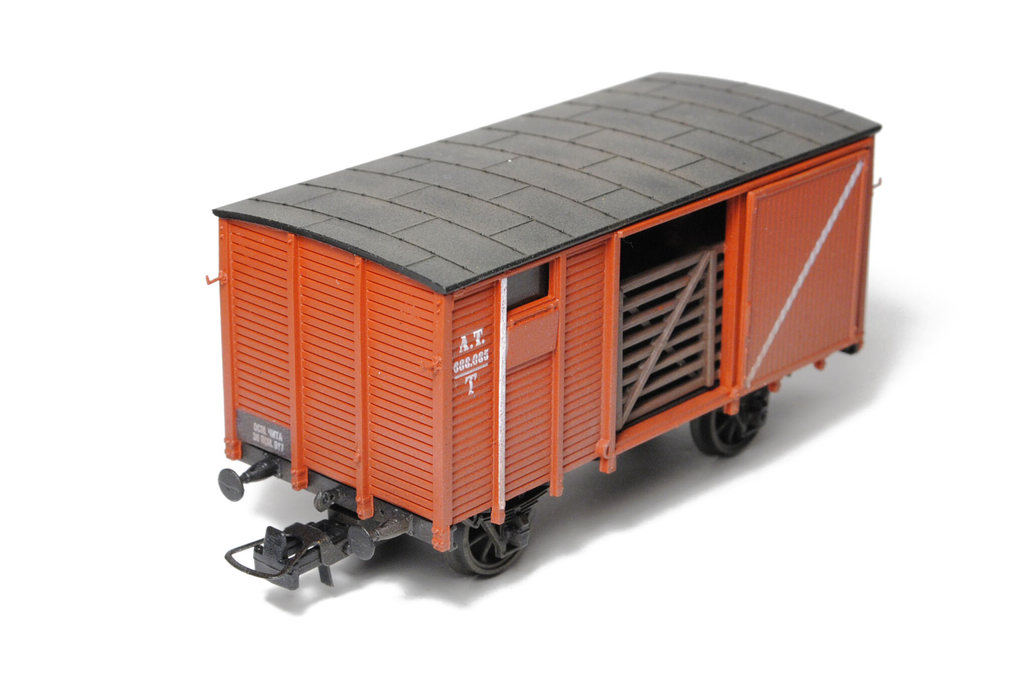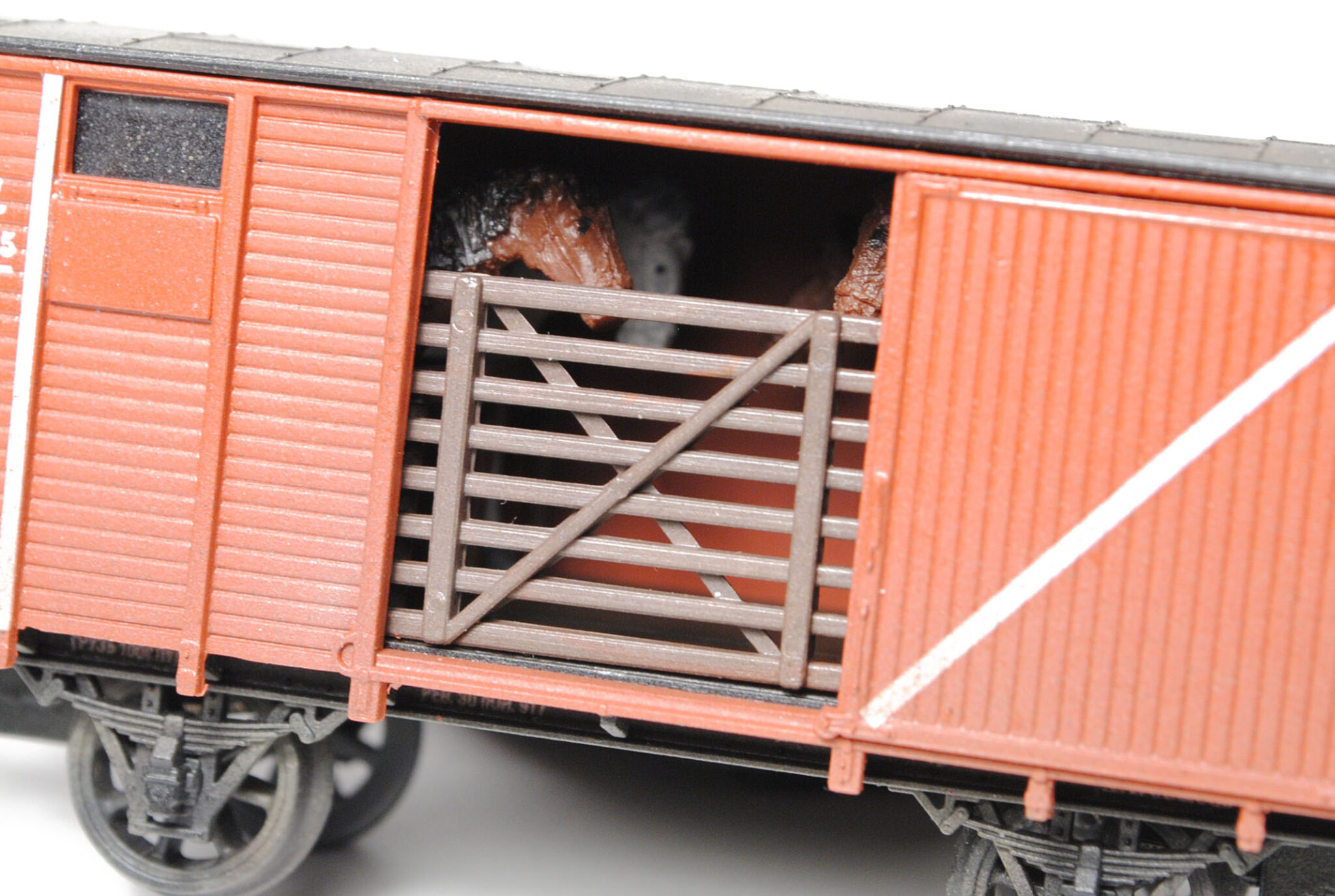 Kompletní plastiková stavebnice železničního vozu typu HTB Československých legií působících v Rusku – převoz koní. Obsahuje 4 koně, probarvené plastikové výlisky na sestavení modelu včetně kinematik, spřáhel a dvojkolí, kovové lepty, závaží a obtisky.