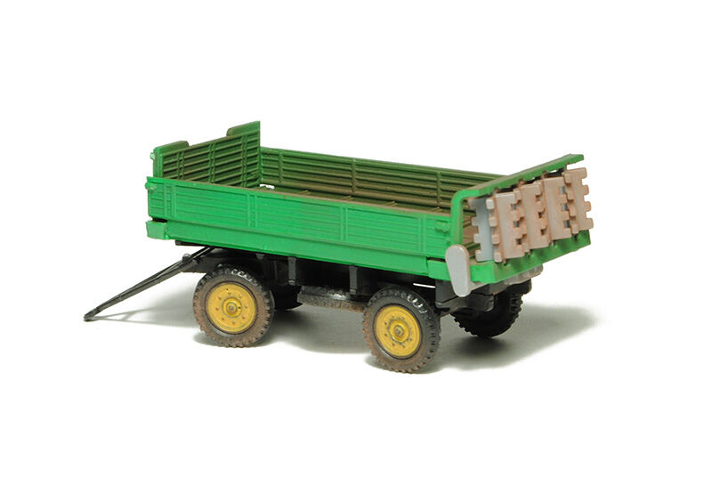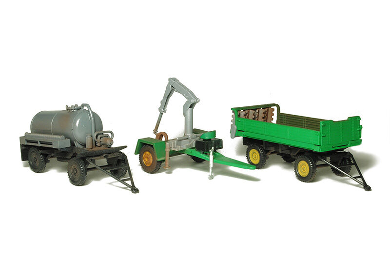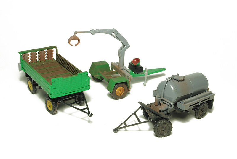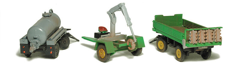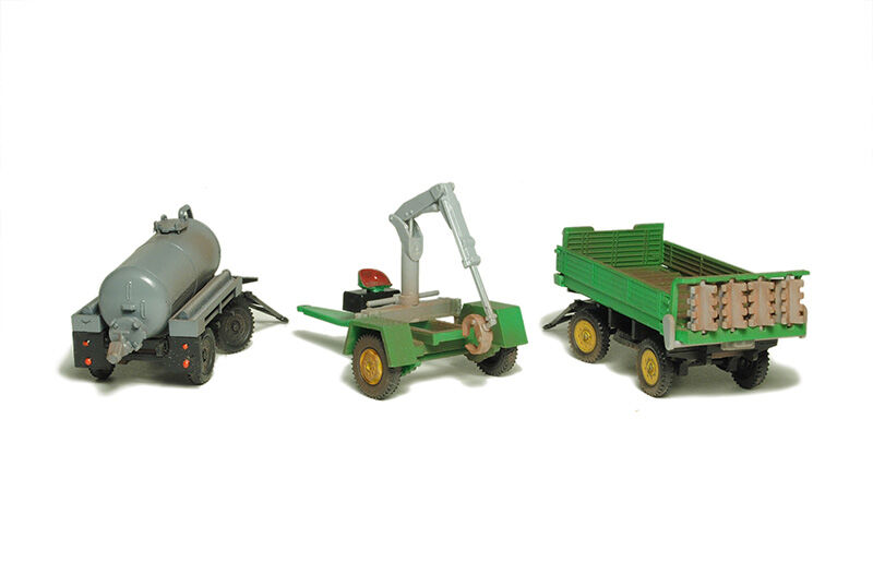 Kompletní plastiková stavebnice tří zemědělských přívěsů. Obsahuje probarvené plastikové výlisky na sestavení modelů rozmetadla hnoje, nakladače a fekální cisterny.