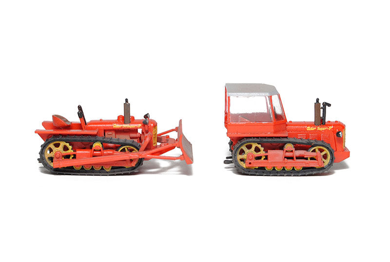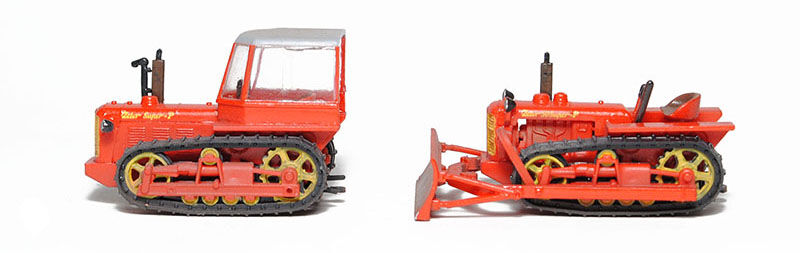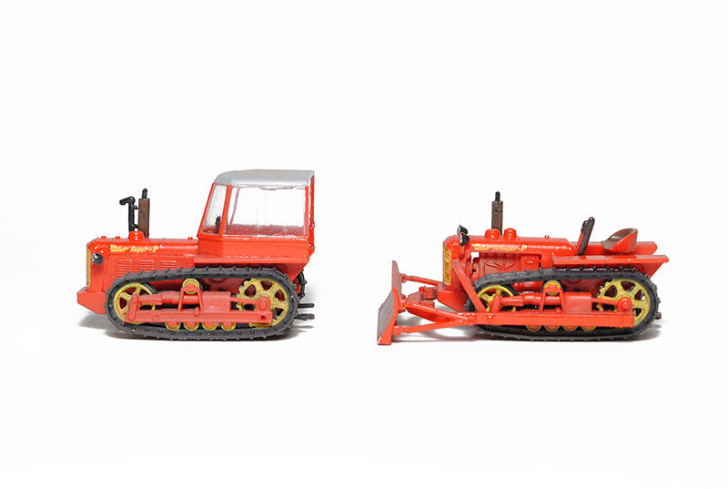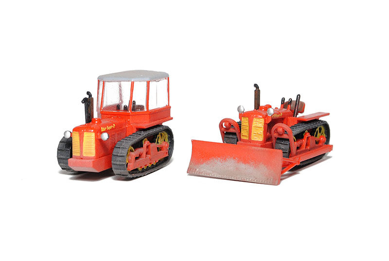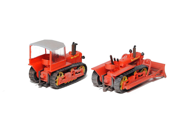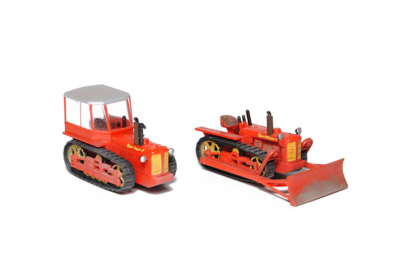 Kompletní plastiková stavebnice dvou pásových traktorů. Obsahuje probarvené plastikové výlisky na sestavení modelů traktorů, které je možné osadit kabinou a radlicí.