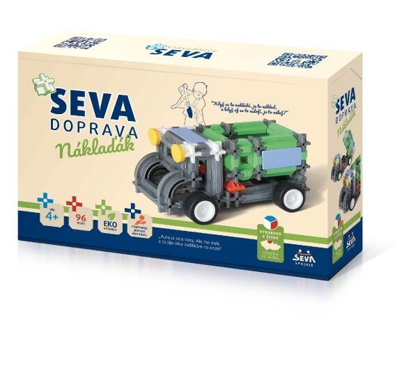 Funkční nákladní auto si můžete poskládat ze 96 dílků, které v balení najdete a nejen to. SEVA DOPRAVA – Náklaďák je doporučená pro děti od 5 let. Kdo chce řídit nákladní auto, letadlo, malý traktůrek či jiné auto, má se stavebnicí SEVA jedinečnou možnost postavit si nejrůznější modely. Ohromnou výhodou stavebnice SEVA je, že je ji možné kombinovat s ostatními stavebnicemi a rozšiřovat tak její možnosti.