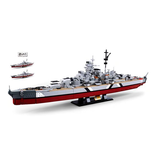 Bitevní loď Bismarck 2v1 je stavebnice modelu německé bitevní lodi z druhé světové války. Model je v poměru 1:350 po sestavení dlouhý 75cm a vysoký téměř 23cm. Součásti stavebnice je tištěný návod a nálepky. Inovativní stavebnice Sluban je možno kombinovat s podobnými stavebnicemi mnoha dalších významných výrobců. Jsou vyráběny z kvalitního, nezávadného a odolného ABS plastu. Každá stavebnice je opatřena návodem k sestavení a balena v pestře potištěné papírové krabičce.