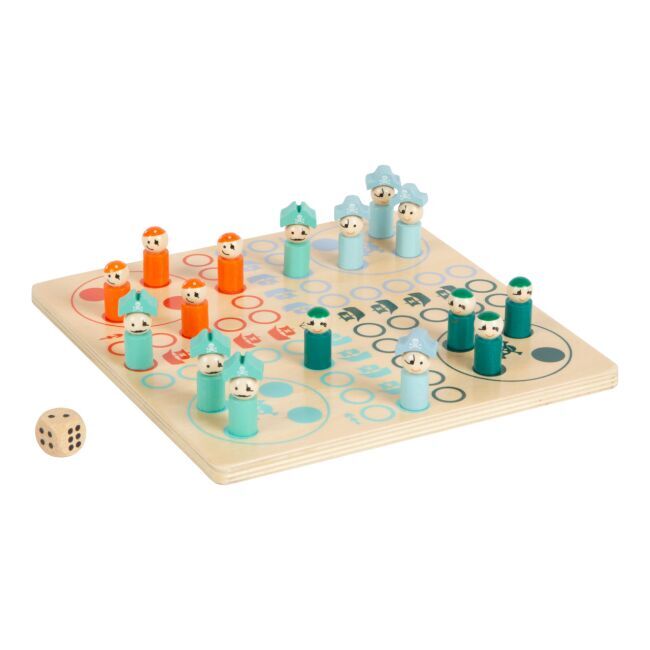 Bukanýři, pozor! Dřevěné Člověče s bukanýry na palubě. Cílem je dostat všechny piráty na svou loď. Kostka ukazuje o kolik polí se můžete posunout. Děti si procvičí počty zábavným způsobem. Herní figurky jsou velmi detailní, hra má kompaktní velikost.