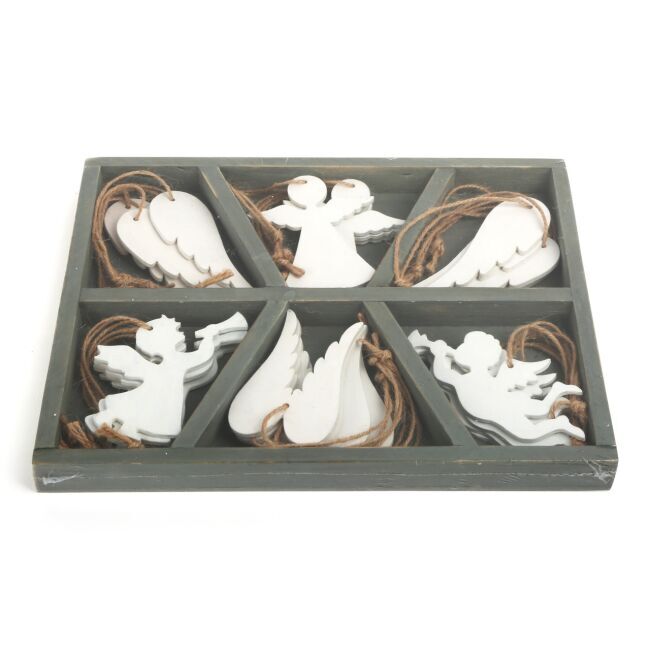 Krásná sada 18 ks vánočních ozdob v bílé barvě s motivem andělů a andělských křídel. Baleno v praktické dřevěné krabičce.