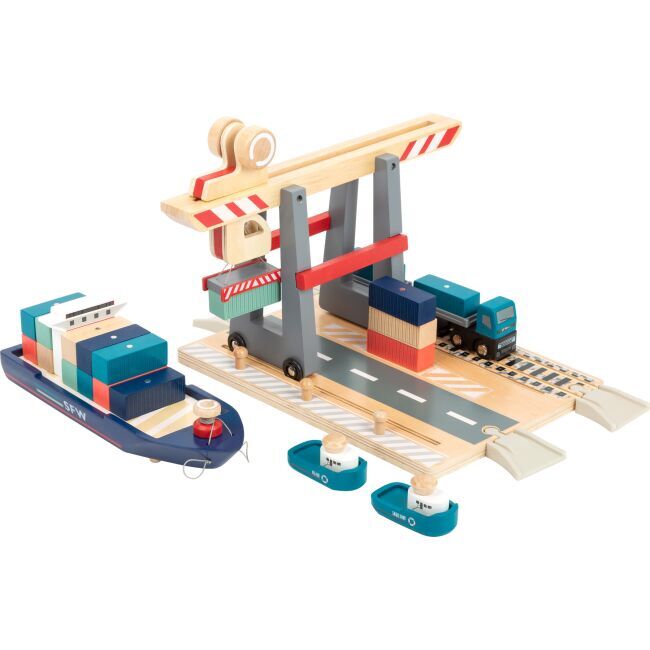 Skvělá zábava pro malé kormidelníky, která nesmí chybět v žádném pokojíčku! Tato hrací sada obsahuje základní desku s kolejemi pro vláčky s mostem a pohyblivým magnetickým jeřábem. Součástí sady je také kontejnerová loď s dvěma remorkéry, které k ní jsou přivazány provázkem. Díky magnetům na kontejnerech je možné jeřábem přemisťovat náklad z místa na místo.