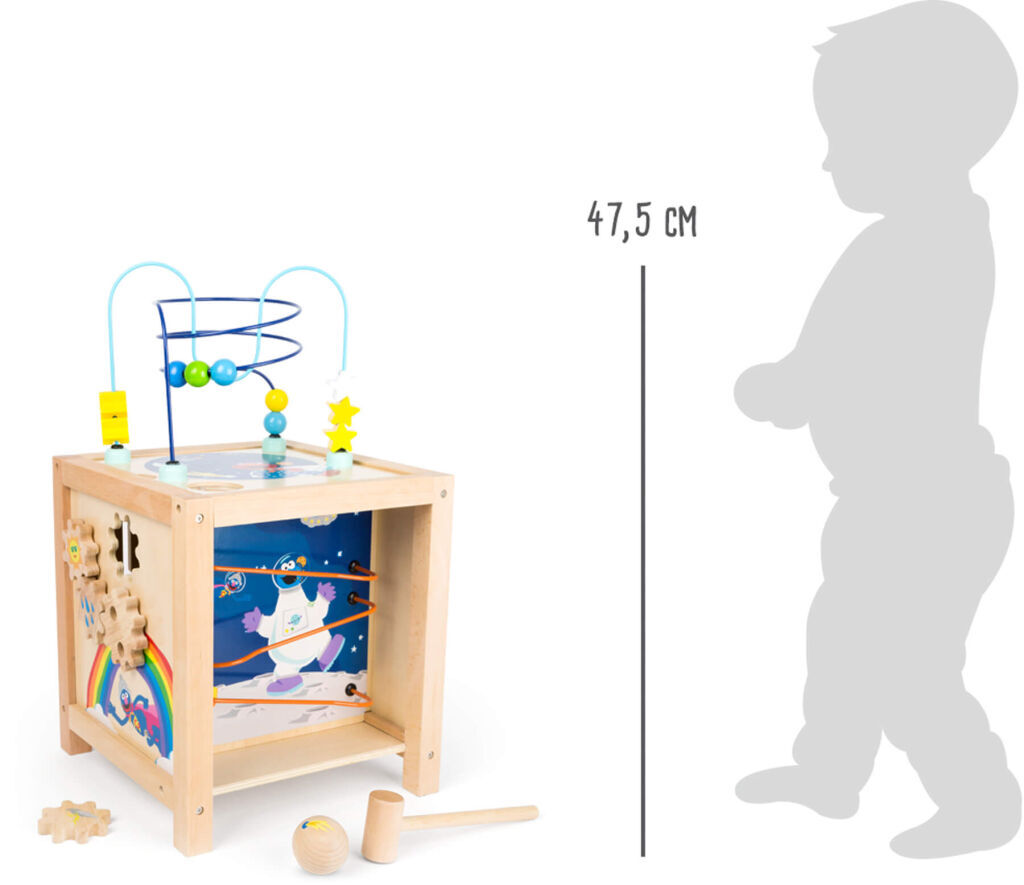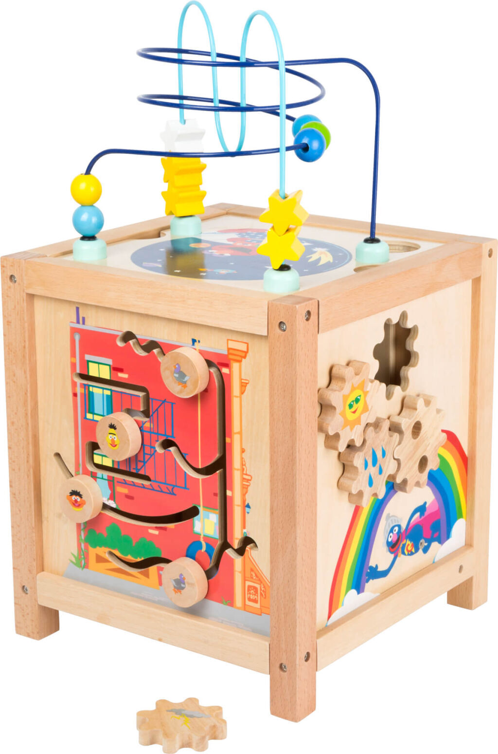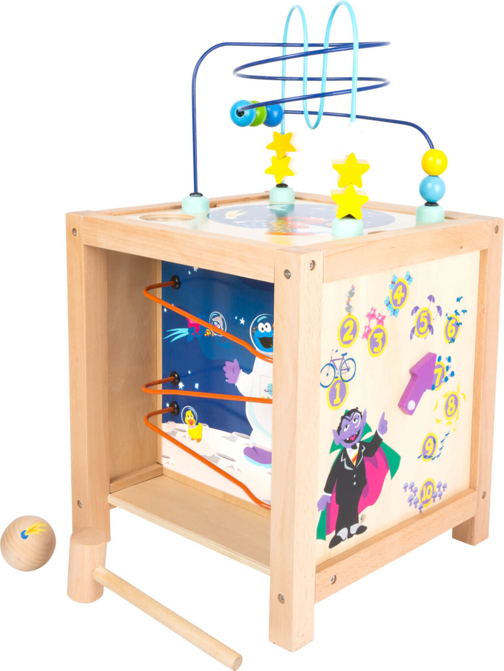 Pět stran, které jsou plné her, nadšení a zábavy. Tato rozmanitá motorická kostka je vyrobena ze stabilního 100% FSC® dřeva a najdete na ní známé postavy z pohádky Sezame, otevři se. Každá strana kostky nabízí specifickou motorickou zábavu, která zapojí všechny smysly dětí. Mnoho dětí se bojí, když je čas jít spát, s tím jim pomůže Elmo. Korálková dráha v motivu noční oblohy děti uklidní. Na další straně pak ozubená kola, která dětem vysvětlí, jak vzniká duha. Je zde i otvor pro vložení jednoho ozubeného kolečka, které tak vytvoří zvuk hromu! Jezdící kolečka dětem povypráví o denní rutině Ernieho a Berta. Během hry s kostkou Sezame, otevři se si děti hravě procvičí svou motoriku. Zatloukací hra pošle dřevěné míčky přímo bránou Sezamu! Hrabě Drákula děti naučí základní počty. Perfektní hračka, která děti zabaví na dlouhé hodiny.