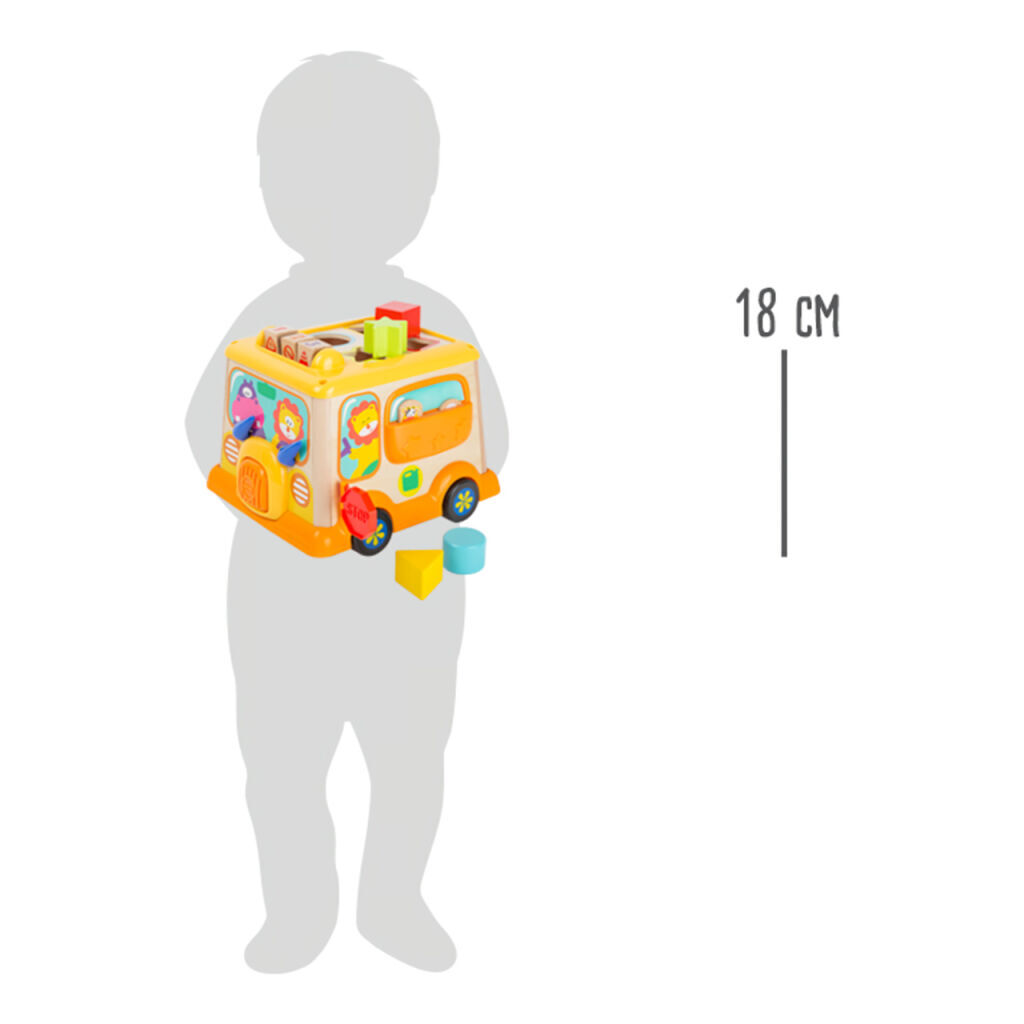 Tady bude spousta zábavy! Na všech stranách tohoto školního autobusu je něco, co byste měli objevit. Ať už se jedná o pohyblivé stěrače čelního skla s cvakáním, učení se číslům a tvarům nebo prostě jen troubit na klakson. Batolata mohou trénovat své jemné motorické dovednosti a hravě podporovat rozvoj své fantazie a kreativity. Značka stop a kostky semaforu jim dávají první pochopení pravidel silničního provozu, zatímco geometrické dřevěné tvary lze snadno vyjmout ze školního autobusu přes dvířka na zadní straně. Velká vzdělávací hračka i v malých hracích prostorách.