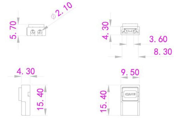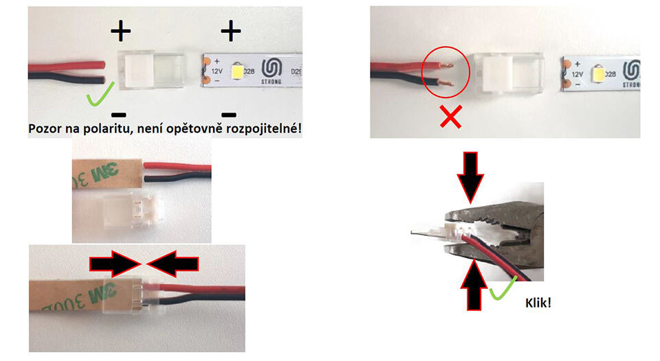 Slouží k propojení LED pásku o šířce 8mm s napájecím kabelem viz. související sortiment. Vhodný do všech hliníkových profilů pro LED pásky krom profilů Slim, Pen a Mikro. Rychlospojky jsou vhodné i na propojení dvou LED pásků v rozích a to s pomocí krátké dvojlinky. Délka 15,5mm, šířka 9,5mm, výška 4,5mm (5,5mm před zacvaknutím). Délka LED pásku vevnitř spojky 11mm, délka kabelu vevnitř spojky 6mm. Max. zatížení 5A (12V/60W, 24V/120W). Průměr kabelu max. 0,5 mm2