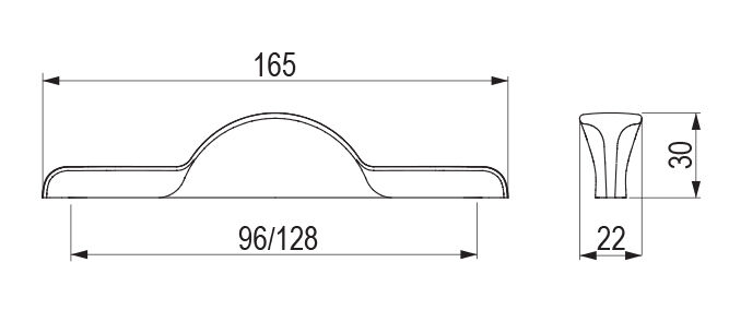 Kovová úchytka s roztečí 96/128mm, v celkové délce 165mm. Šířka: 22mm Výška: 30mm