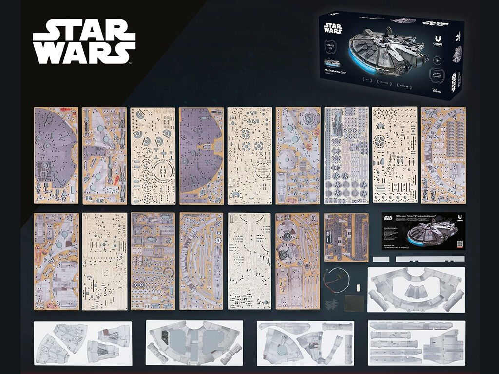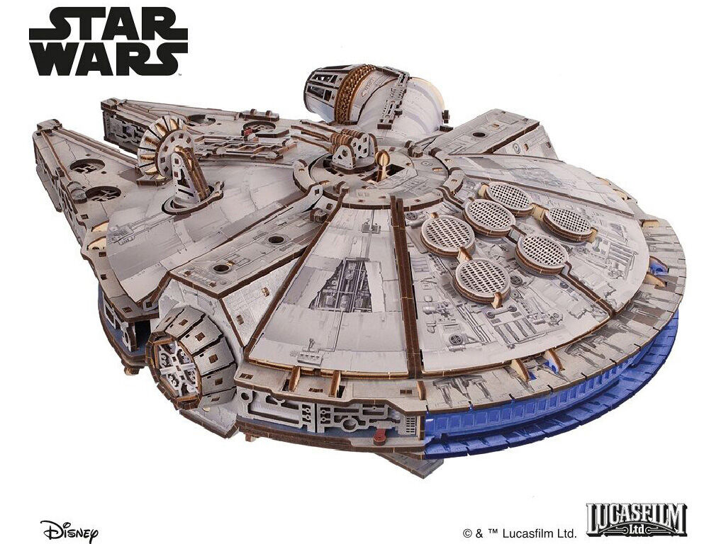 Mezi pohyblivé prvky patří dveře nákladového prostoru, rampa, podvozek, dělostřelecké věže, anténa otočná o 360° a zatahovací střecha, která se otevírá na části a umožňuje zobrazit opravdu detailní a realistický interiér lodi. Dřevovláknitá deska s vysokou hustotou a karton dodávají lodi větší odolnost a zajímavý vzhled. Postavte si kus filmové historie, postavte si impozantní 3D model lodi Millennium Falcon.