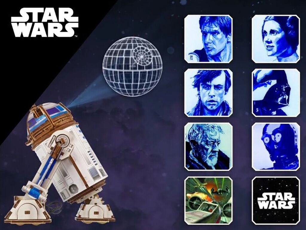 Je malý, ale šikovný! Dřevěný model z barevné překližky má mnoho detailů a věrně zachycuje design tohoto oblíbeného droida. R2-D2 sloužil legendárním hrdinům jako je Anakin Skywalker, Padmé Amidala, Luke Skywalker… nyní je připraven sloužit vám. Je vybaven pohyblivými nohami, které lze nastavit do dvou pozic, a funkčním LED projektorem, přes který odhalí obrázky postav ze Star Wars. Kouzlo galaxie může přinést i do vaší poličky.