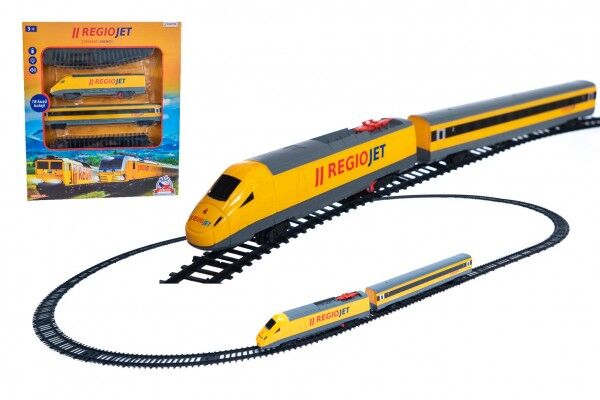 Vlak žlutý RegioJet s kolejnicemi 18ks plast se zvukem a světlem v krabici 38x43x6cm
