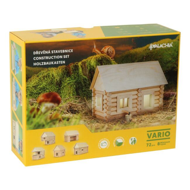 Variabilní stavebnice české výroby umožňuje sestavovat a znovu rozebírat nejméně 8 různých typů budov. Skládá se zejména z robustních kulatých, pečlivě opracovaných bukových dřívek s půlkulatými zámky, manipulace s nimi je výjimečně snadná a bezpečná. Obsahuje však také řadu precizně zpracovaných dílů dveří a oken, kompletní soupis jednotlivých součástí naleznete níže. Stavebnice řady Vario jsou mezi sebou kompatibilní, lze je kombinovat a vytvářet stále nové, rozmanité stavby, mohou tak růst spolu se schopnostmi a dovednostmi dětí. Přírodní povrchová úprava dílů umožňuje individuální úpravy jejich vzhledu, lze je lakovat a barvit dle fantazie. Díky svým jedinečným vlastnostem a zpracování může stavebnice nabídnout vysokou životnost a představovat zábavu předávanou po generace. Dodáváno v pevné a odolné kartónové krabici.