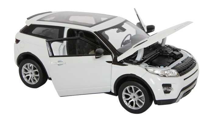 Detailní model bílého Land Rover Range Roveru Evoque z kovu a plastu má otevíratelné dveře i kapotu. Věrnost těchto modelů zvyšuje použití laků, které mají shodný barevný odstín jako skutečná auta. Měřítko 1:24 je zhotovením na hraně mezi sběratelským modelem a hračkou, autíčka vyžadují opatrnější zacházení. Dodáváno v různobarevné papírové krabičce s plastovým průhledem.